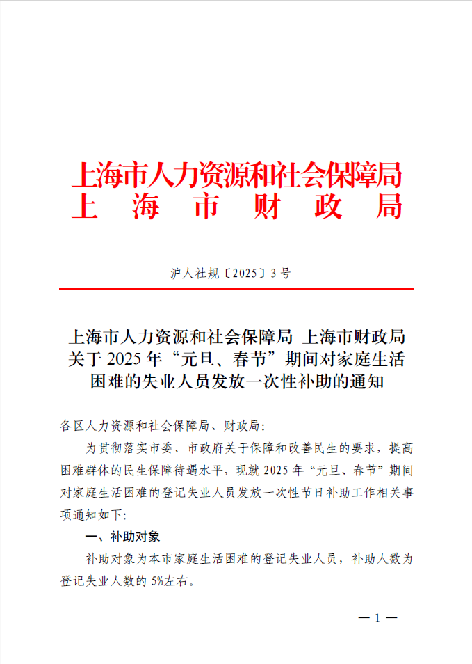 为贯彻落实市委、市政府关于保障和改善民生的要求,提高困难群体的民生保障待遇水平,现就2025年“元旦、春节”期间对家庭生活困难的登记失业人员发放一次性节日补助工作相关事项通知如下: