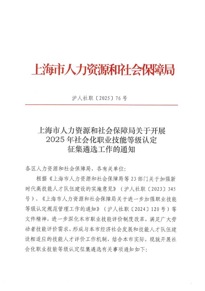 根据《上海市人力资源和社会保障局等23部门关于加强新时代高技能人才队伍建设的实施意见》(沪人社职〔2023〕345号)、《上海市人力资源和社会保障局关于进一步加强职业技能等级认定规范管理工作的通知》(沪人社职〔2024〕120号)等文件精神,进一步深化本市职业技能评价制度改革,满足广大劳动者技能评价需求,形成与本市经济社会发展和技能人才队伍建设相适应的技能人才评价工作机制,结合本市实际,现就开展社会化职业技能等级认定征集遴选有关事项通知如下: