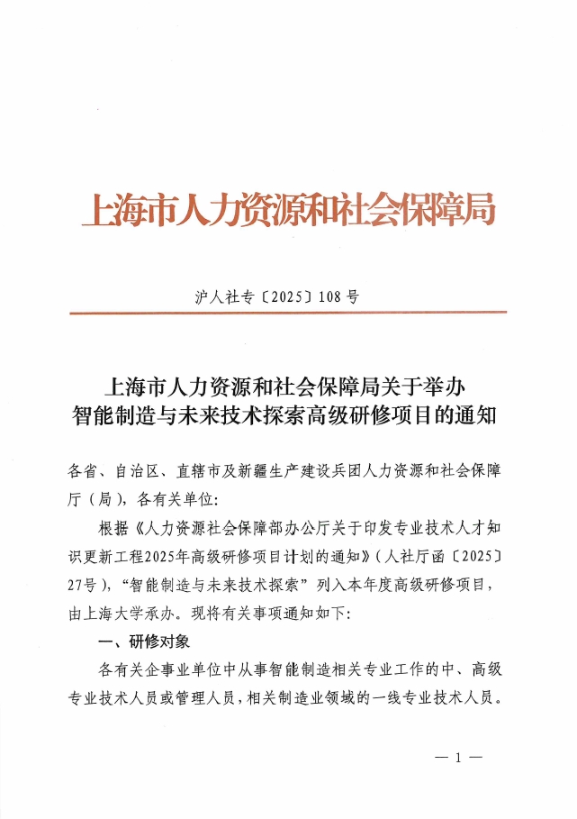 根据《人力资源社会保障部办公厅关于印发专业技术人才知识更新工程2025年高级研修项目计划的通知》(人社厅函〔2025〕27号),“智能制造与未来技术探索”列入本年度高级研修项目,由上海大学承办。现将有关事项通知如下: