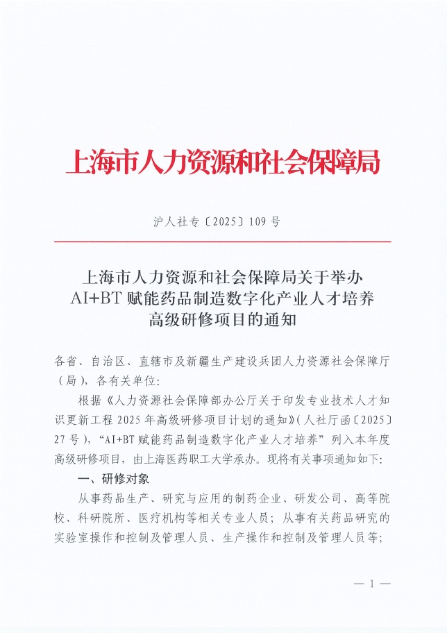 根据《人力资源社会保障部办公厅关于印发专业技术人才知识更新工程2025年高级研修项目计划的通知》(人社厅函〔2025〕27号),“AI+BT赋能药品制造数字化产业人才培养”列入本年度高级研修项目,由上海医药职工大学承办。现将有关事项通知如下:
