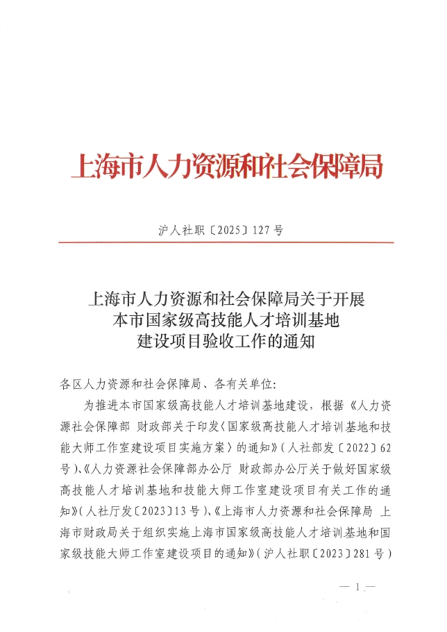 为推进本市国家级高技能人才培训基地建设,根据《人力资源社会保障部 财政部关于印发〈国家级高技能人才培训基地和技能大师工作室建设项目实施方案〉的通知》(人社部发〔2022〕62号)、《人力资源社会保障部办公厅 财政部办公厅关于做好国家级高技能人才培训基地和技能大师工作室建设项目有关工作的通知》(人社厅发〔2023〕13号)、《上海市人力资源和社会保障局 上海市财政局关于组织实施上海市国家级高技能人才培训基地和国家级技能大师工作室建设项目的通知》(沪人社职〔2023〕281号)等要求,结合本市实际情况,现就开展本市国家级高技能人才培训基地建设项目(以下简称“建设项目”)验收工作的有关事项通知如下: