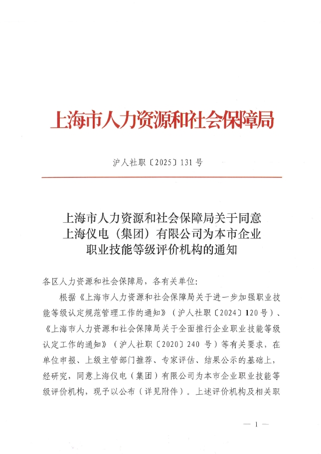 根据《上海市人力资源和社会保障局关于进一步加强职业技能等级认定规范管理工作的通知》(沪人社职〔2024〕120号)、《上海市人力资源和社会保障局关于全面推行企业职业技能等级认定工作的通知》(沪人社职〔2020〕240号)等有关要求,在单位申报、上级主管部门推荐、专家评估、结果公示的基础上,经研究,同意上海仪电(集团)有限公司为本市企业职业技能等级评价机构,现予以公布(详见附件)。上述评价机构及相关职业(工种)信息将由“市人力资源社会保障局网站”(http://rsj.sh.gov.cn)和“技能人才评价工作网”(www.osta.org.cn)向社会公开并提供查询服务。