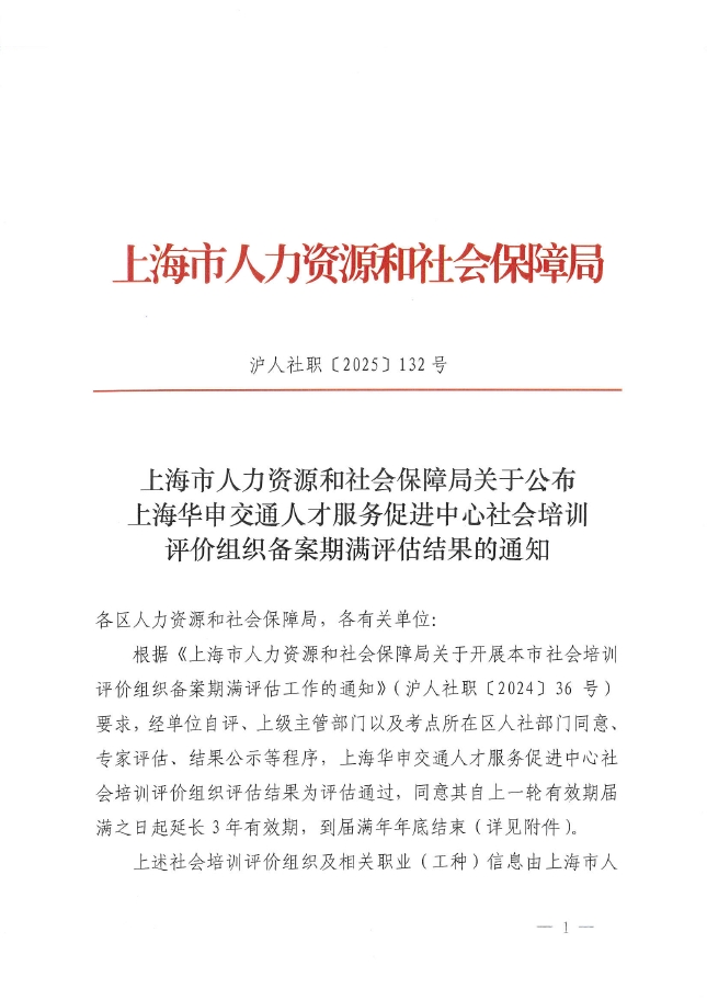 根据《上海市人力资源和社会保障局关于开展本市社会培训评价组织备案期满评估工作的通知》(沪人社职〔2024〕36号)要求,经单位自评、上级主管部门以及考点所在区人社部门同意、专家评估、结果公示等程序,上海华申交通人才服务促进中心社会培训评价组织评估结果为评估通过,同意其自上一轮有效期届满之日起延长3年有效期,到届满年年底结束(详见附件)。