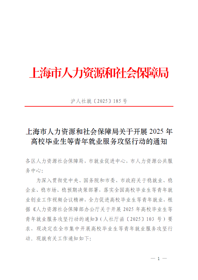 为深入贯彻党中央、国务院和市委、市政府关于稳就业、稳企业、稳市场、稳预期决策部署,落实全国高校毕业生等青年就业创业工作视频会议精神,全力促进高校毕业生等青年就业,根据《人力资源社会保障部办公厅关于开展2025年高校毕业生等青年就业服务攻坚行动的通知》(人社厅函〔2025〕103号)要求,现决定在全市集中开展高校毕业生等青年就业服务攻坚行动。现就有关工作通知如下: