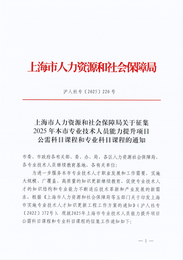 为进一步服务本市专业技术人才职业发展和工作需要,实施大规模、广覆盖、高质量的知识更新继续教育,促使专业技术人才的知识结构和专业能力不断适应技术革新和产业发展的新需求,根据《上海市人力资源和社会保障局等五部门关于印发上海市实施专业技术人才知识更新工程工作方案的通知》(沪人社专〔2022〕372号),现就2025年上海市专业技术人员能力提升项目公需科目课程和专业科目课程的征集工作通知如下: