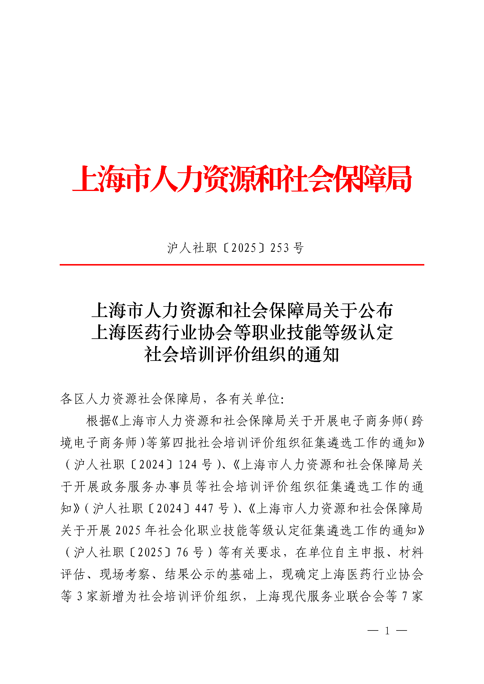根据《上海市人力资源和社会保障局关于开展电子商务师(跨境电子商务师)等第四批社会培训评价组织征集遴选工作的通知》(沪人社职〔2024〕124号)、《上海市人力资源和社会保障局关于开展政务服务办事员等社会培训评价组织征集遴选工作的通知》(沪人社职〔2024〕447号)、《上海市人力资源和社会保障局关于开展2025年社会化职业技能等级认定征集遴选工作的通知》(沪人社职〔2025〕76号)等有关要求,在单位自主申报、材料评估、现场考察、结果公示的基础上,现确定上海医药行业协会等3家新增为社会培训评价组织,上海现代服务业联合会等7家社会培训评价组织新增社会化评价项目,并予以公布(详见附件)。上述评价机构及相关职业(工种)信息将由“市人力资源社会保障局网站”(http://rsj.sh.gov.cn)和“技能人才评价工作网”(www.osta.org.cn)向社会公开并提供查询服务。其他遴选结果后续将另行动态发布。
