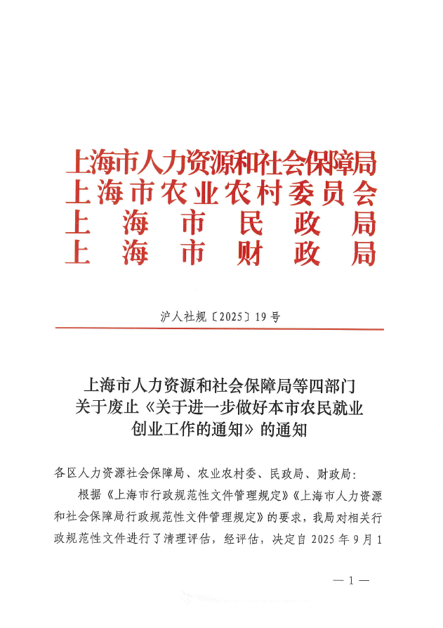 根据《上海市行政规范性文件管理规定》《上海市人力资源和社会保障局行政规范性文件管理规定》的要求,我局对相关行政规范性文件进行了清理评估,经评估,决定自2025年9月1日起废止《关于进一步做好本市农民就业创业工作的通知》(沪人社规〔2019〕35号)。2025年8月31日前已按此文件申请郊区农民跨区就业补贴和低收入农户家庭人员就业补贴的人员,补贴审核和发放等按原规定执行。《上海市人力资源和社会保障局等四部门关于延长〈关于进一步做好本市农民就业创业工作的通知〉有效期的通知》(沪人社规〔2024〕22号)、《上海市人力资源和社会保障局关于进一步做好本市郊区农民跨区就业补贴工作的补充通知》(沪人社就〔2025〕19号)同时废止。