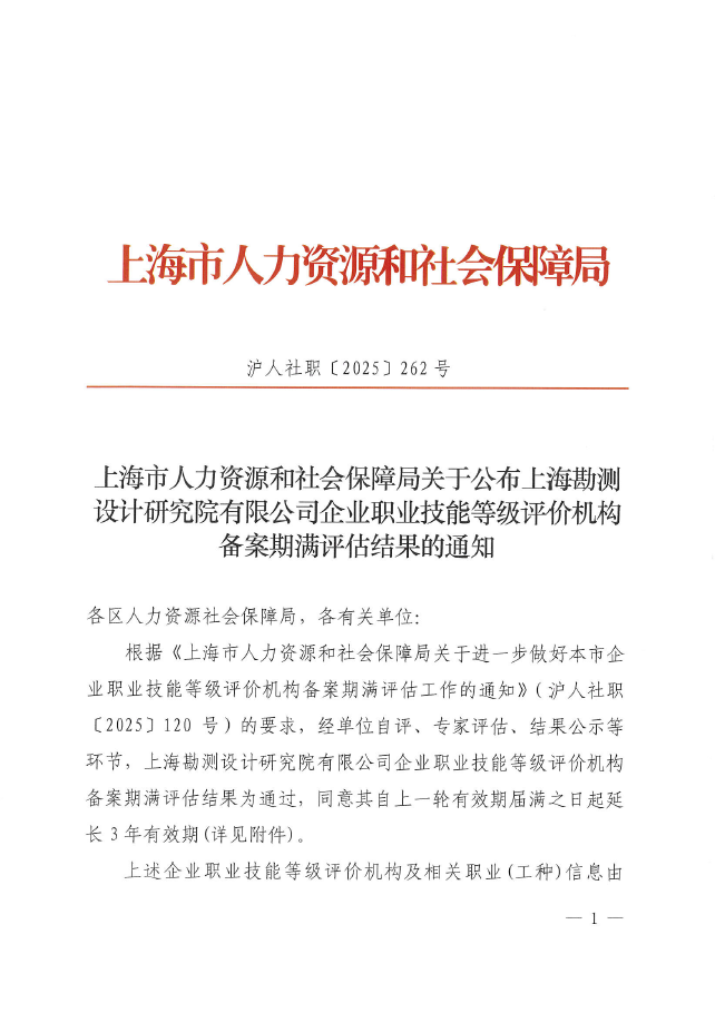 根据《上海市人力资源和社会保障局关于进一步做好本市企业职业技能等级评价机构备案期满评估工作的通知》(沪人社职〔2025〕120号)的要求,经单位自评、专家评估、结果公示等环节,上海勘测设计研究院有限公司企业职业技能等级评价机构备案期满评估结果为通过,同意其自上一轮有效期届满之日起延长3年有效期(详见附件)。