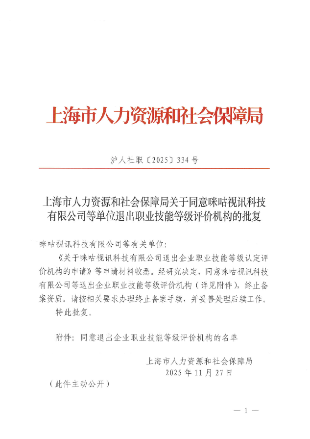 《关于咪咕视讯科技有限公司退出企业职业技能等级认定评价机构的申请》等申请材料收悉。经研究决定,同意咪咕视讯科技有限公司等退出企业职业技能等级评价机构(详见附件),终止备案资质。请按相关要求办理终止备案手续,并妥善处理后续工作。