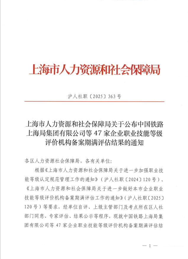 根据《上海市人力资源和社会保障局关于进一步加强职业技能等级认定规范管理工作的通知》(沪人社职〔2024〕120号)、《上海市人力资源和社会保障局关于进一步做好本市企业职业技能等级评价机构备案期满评估工作的通知》(沪人社职〔2025〕120号)等要求,经单位自评、上级主管部门及考点所在区人社部门同意、专家评估、结果公示等程序,现就中国铁路上海局集团有限公司等47家企业职业技能等级评价机构备案期满评估结果公布如下: