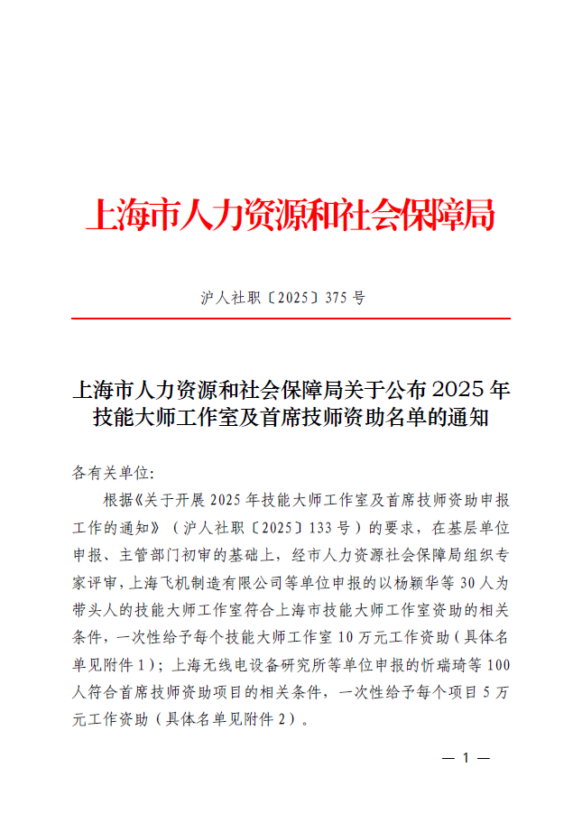 根据《关于开展2025年技能大师工作室及首席技师资助申报工作的通知》(沪人社职〔2025〕133号)的要求,在基层单位申报、主管部门初审的基础上,经市人力资源社会保障局组织专家评审,上海飞机制造有限公司等单位申报的以杨颖华等30人为带头人的技能大师工作室符合上海市技能大师工作室资助的相关条件,一次性给予每个技能大师工作室10万元工作资助(具体名单见附件1);上海无线电设备研究所等单位申报的忻瑞琦等100人符合首席技师资助项目的相关条件,一次性给予每个项目5万元工作资助(具体名单见附件2)。