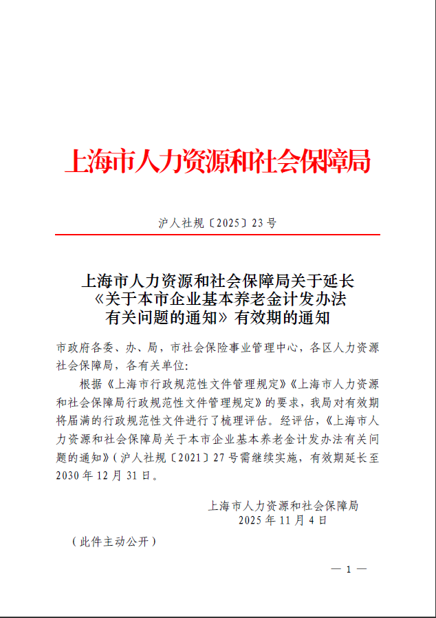 根据《上海市行政规范性文件管理规定》《上海市人力资源和社会保障局行政规范性文件管理规定》的要求,我局对有效期将届满的行政规范性文件进行了梳理评估。经评估,《上海市人力资源和社会保障局关于本市企业基本养老金计发办法有关问题的通知》(沪人社规〔2021〕27号需继续实施,有效期延长至2030年12月31日。