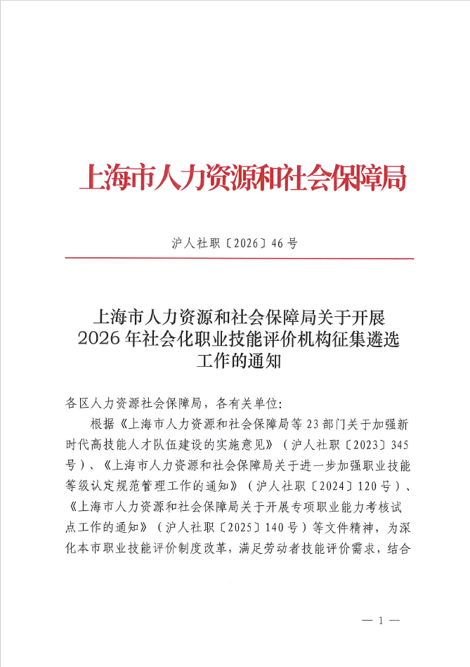 根据《上海市人力资源和社会保障局等23部门关于加强新时代高技能人才队伍建设的实施意见》(沪人社职〔2023〕345号)、《上海市人力资源和社会保障局关于进一步加强职业技能等级认定规范管理工作的通知》(沪人社职〔2024〕120号)、《上海市人力资源和社会保障局关于开展专项职业能力考核试点工作的通知》(沪人社职〔2025〕140号)等文件精神,为深化本市职业技能评价制度改革,满足劳动者技能评价需求,结合本市产业发展和技能人才培养实际,现就2026年社会化职业技能评价机构(含评价项目)征集遴选有关事项通知如下: