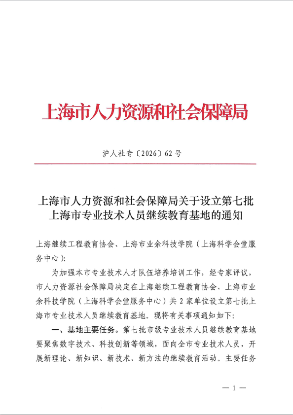 为加强本市专业技术人才队伍培养培训工作,经专家评议,市人力资源社会保障局决定在上海继续工程教育协会、上海市业余科技学院(上海科学会堂服务中心)共2家单位设立第七批上海市专业技术人员继续教育基地。现将有关事项通知如下: