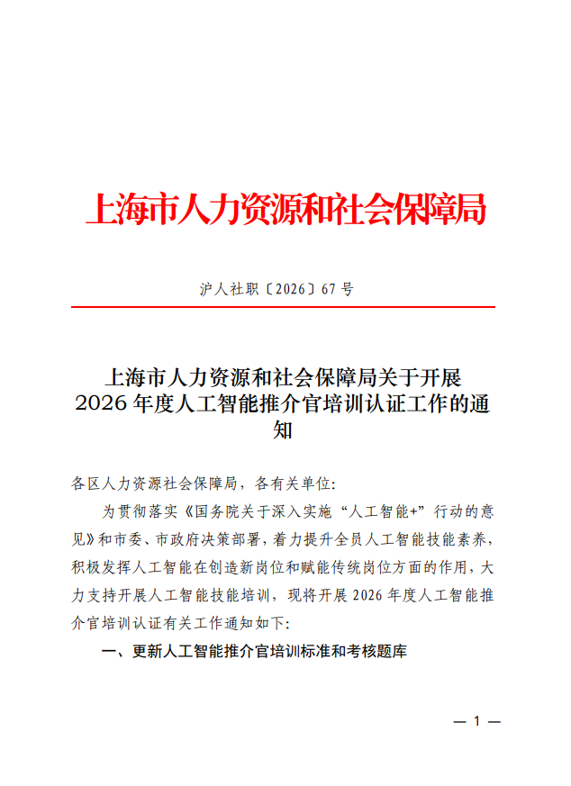 为贯彻落实《国务院关于深入实施“人工智能+”行动的意见》和市委、市政府决策部署,着力提升全员人工智能技能素养,积极发挥人工智能在创造新岗位和赋能传统岗位方面的作用,大力支持开展人工智能技能培训,现将开展2026年度人工智能推介官培训认证有关工作通知如下: