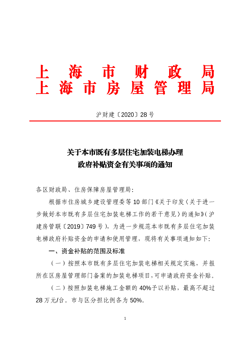 根据市住房城乡建设管理委等10部门《关于印发〈关于进一步做好本市既有多层住宅加装电梯工作的若干意见〉的通知》(沪建房管联〔2019〕749号),为进一步规范本市既有多层住宅加装电梯政府补贴资金的申请和使用管理,现将有关事项通知如下: