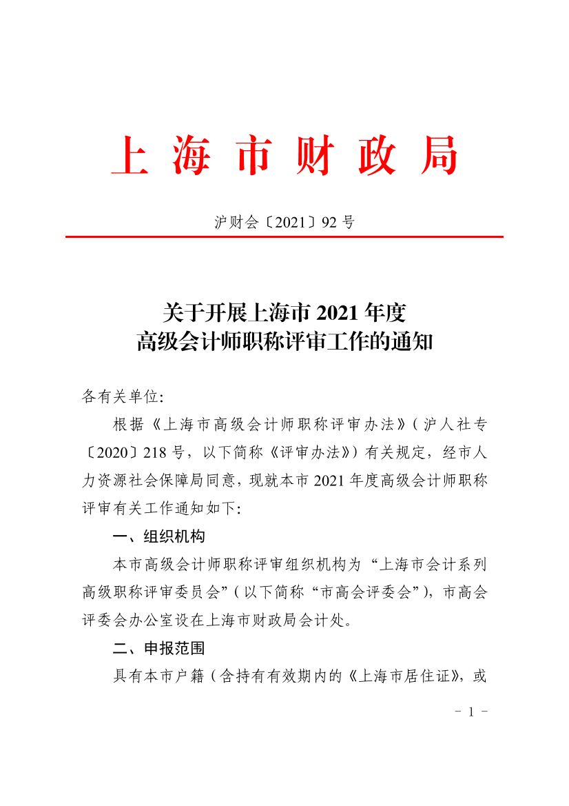 根据《上海市高级会计师职称评审办法》(沪人社专〔2020〕218号,以下简称《评审办法》)有关规定,经市人力资源社会保障局同意,现就本市2021年度高级会计师职称评审有关工作通知如下: