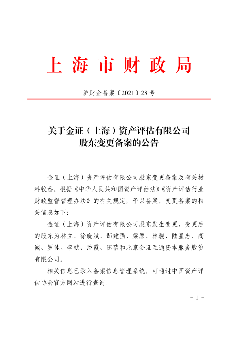 金证(上海)资产评估有限公司股东变更备案及有关材料收悉。根据《中华人民共和国资产评估法》《资产评估行业财政监督管理办法》的有关规定,予以备案。变更备案的相关信息如下: