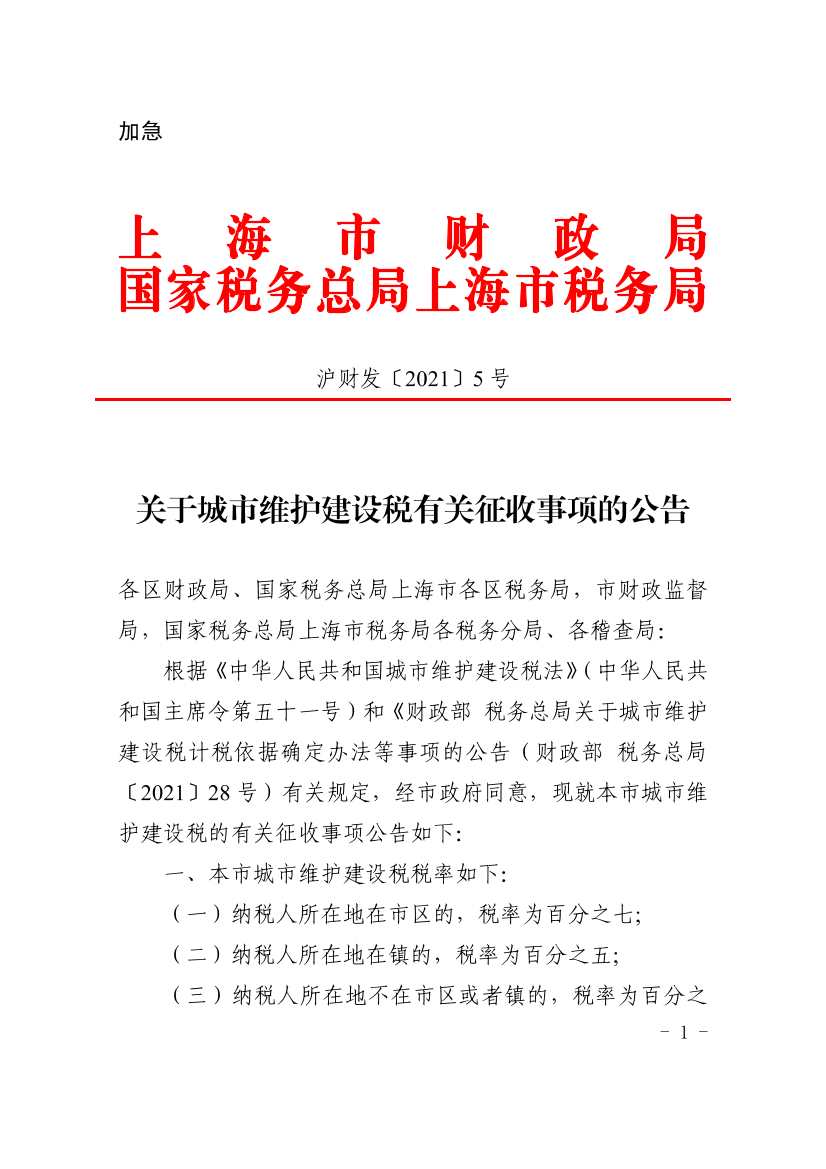 根据《中华人民共和国城市维护建设税法》(中华人民共和国主席令第五十一号)和《财政部 税务总局关于城市维护建设税计税依据确定办法等事项的公告(财政部 税务总局〔2021〕28号)有关规定,经市政府同意,现就本市城市维护建设税的有关征收事项公告如下: