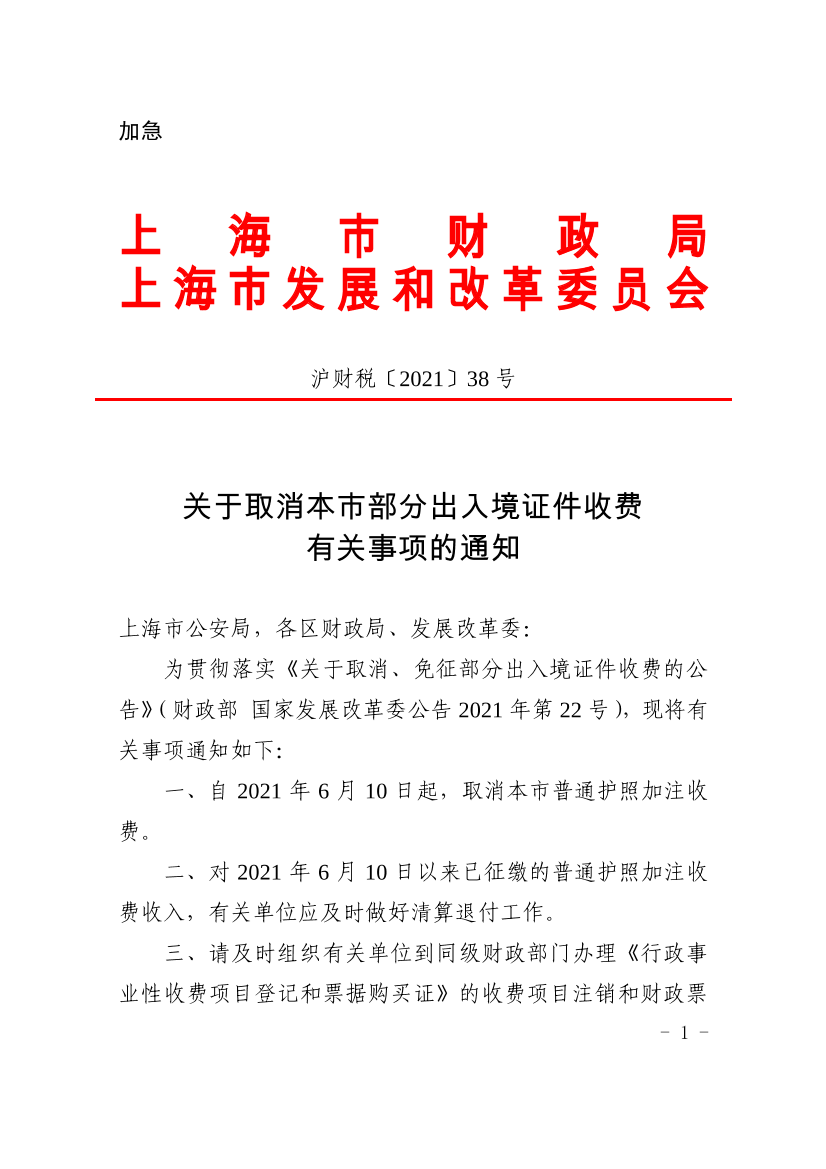 一、自2021年6月10日起,取消本市普通护照加注收费。