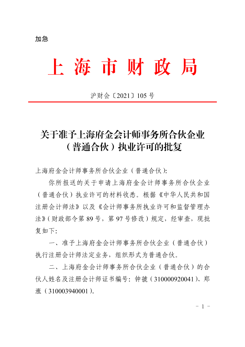 你所报送的关于申请上海府金会计师事务所合伙企业(普通合伙)执业许可的材料收悉。根据《中华人民共和国注册会计师法》以及《会计师事务所执业许可和监督管理办法》(财政部令第89号,第97号修改)规定,经审查,现批复如下: