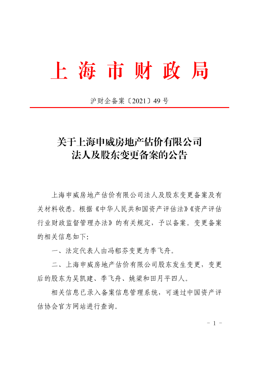 上海申威房地产估价有限公司法人及股东变更备案及有关材料收悉。根据《中华人民共和国资产评估法》《资产评估行业财政监督管理办法》的有关规定,予以备案。变更备案的相关信息如下: