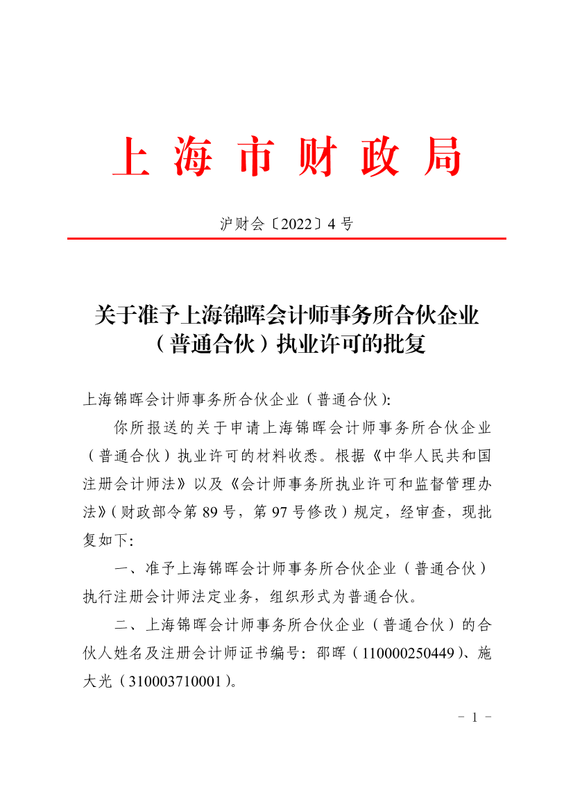你所报送的关于申请上海锦晖会计师事务所合伙企业(普通合伙)执业许可的材料收悉。根据《中华人民共和国注册会计师法》以及《会计师事务所执业许可和监督管理办法》(财政部令第89号,第97号修改)规定,经审查,现批复如下: