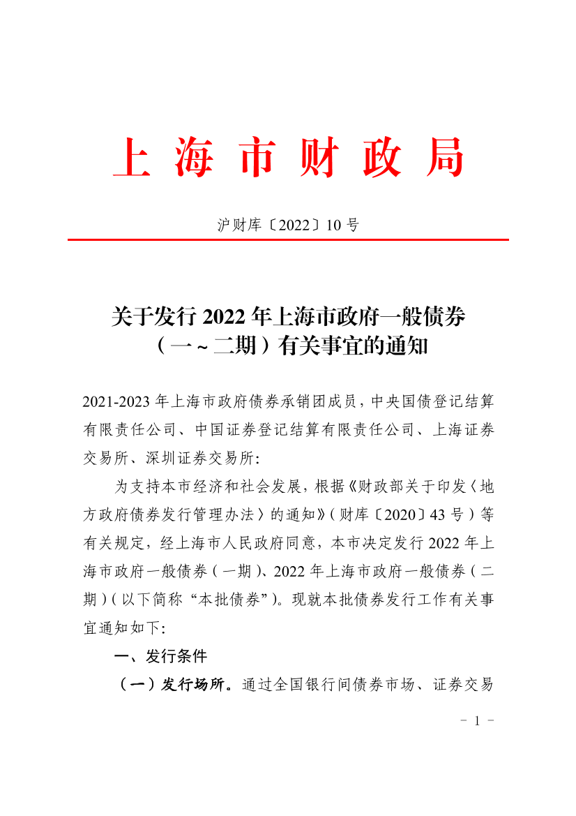 为支持本市经济和社会发展,根据《财政部关于印发〈地方政府债券发行管理办法〉的通知》(财库〔2020〕43号)等有关规定,经上海市人民政府同意,本市决定发行2022年上海市政府一般债券(一期)、2022年上海市政府一般债券(二期)(以下简称“本批债券”)。现就本批债券发行工作有关事宜通知如下: