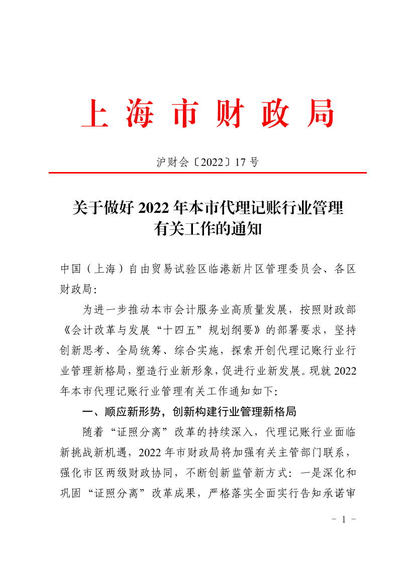 为进一步推动本市会计服务业高质量发展,按照财政部《会计改革与发展“十四五”规划纲要》的部署要求,坚持创新思考、全局统筹、综合实施,探索开创代理记账行业行业管理新格局,塑造行业新形象,促进行业新发展。现就2022年本市代理记账行业管理有关工作通知如下: