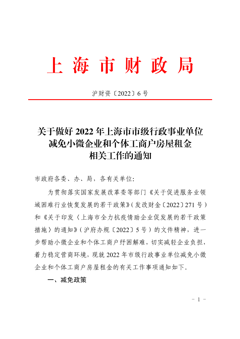 为贯彻落实国家发展改革委等部门《关于促进服务业领域困难行业恢复发展的若干政策》(发改财金〔2022〕271号)和《关于印发〈上海市全力抗疫情助企业促发展的若干政策措施〉的通知》(沪府办规〔2022〕5号)的文件精神,进一步帮助小微企业和个体工商户纾困解难,切实减轻企业负担,着力稳定营商环境,现就2022年市级行政事业单位减免小微企业和个体工商户房屋租金的有关工作事项通知如下。