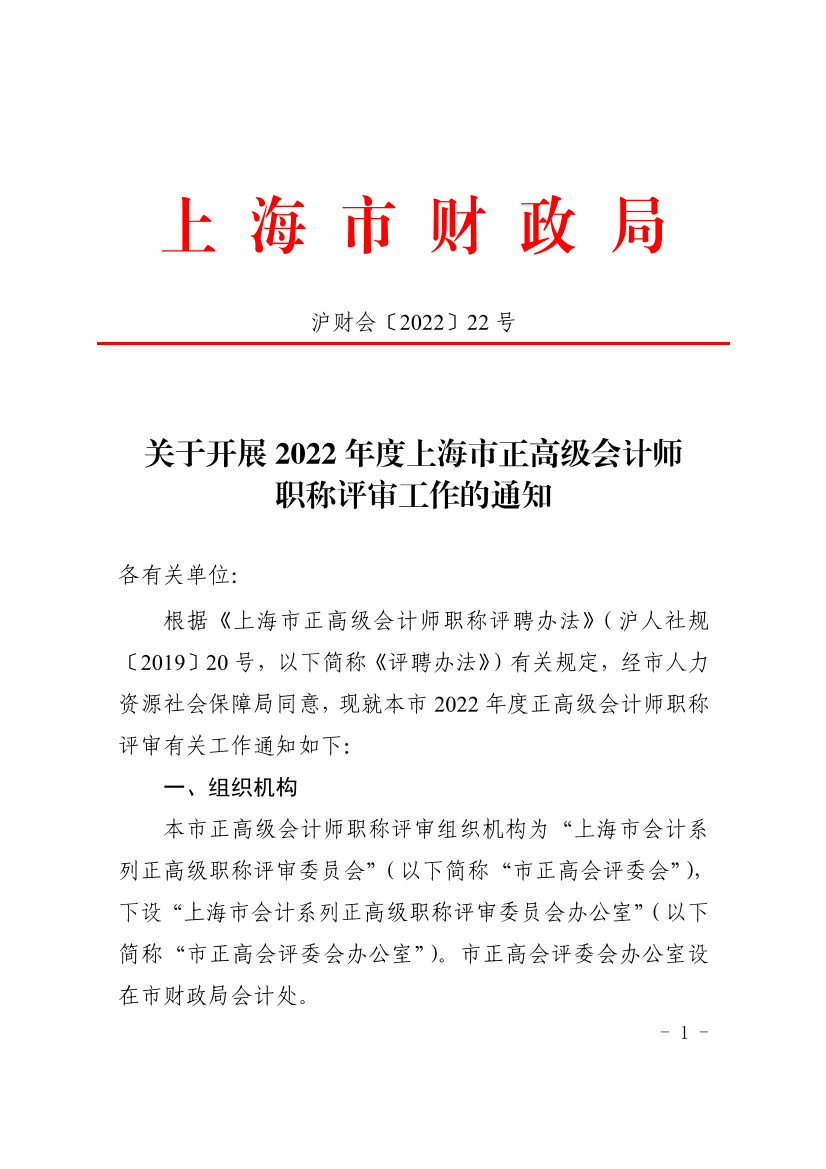 根据《上海市正高级会计师职称评聘办法》(沪人社规〔2019〕20号,以下简称《评聘办法》)有关规定,经市人力资源社会保障局同意,现就本市2022年度正高级会计师职称评审有关工作通知如下: