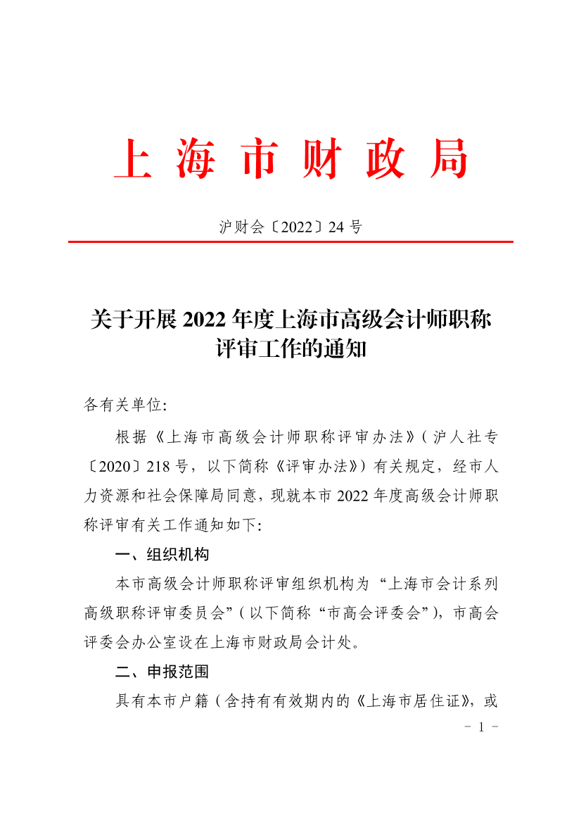 根据《上海市高级会计师职称评审办法》(沪人社专〔2020〕218号,以下简称《评审办法》)有关规定,经市人力资源和社会保障局同意,现就本市2022年度高级会计师职称评审有关工作通知如下: