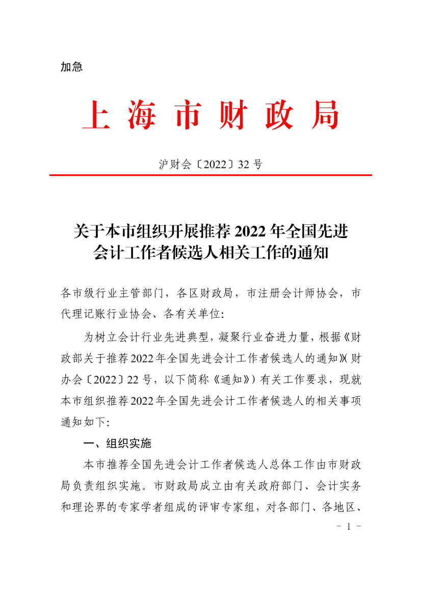 为树立会计行业先进典型,凝聚行业奋进力量,根据《财政部关于推荐2022年全国先进会计工作者候选人的通知》(财办会〔2022〕22号,以下简称《通知》)有关工作要求,现就本市组织推荐2022年全国先进会计工作者候选人的相关事项通知如下: