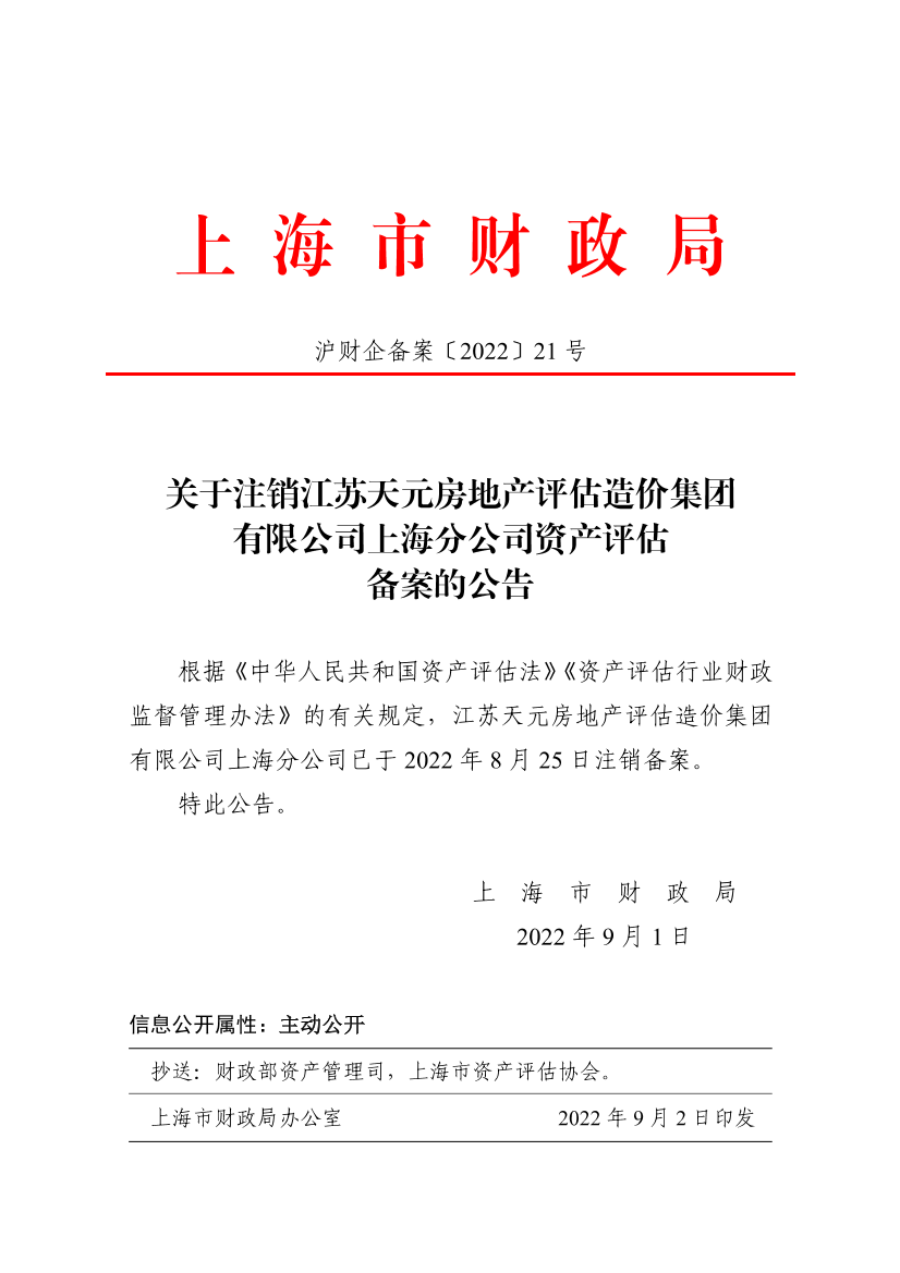 根据《中华人民共和国资产评估法》《资产评估行业财政监督管理办法》的有关规定,江苏天元房地产评估造价集团有限公司上海分公司已于2022年8月25日注销备案。