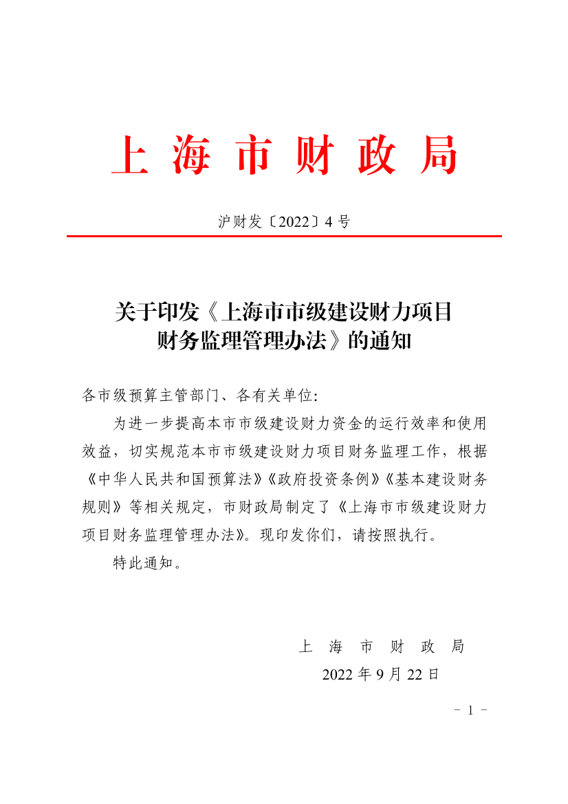 为进一步提高本市市级建设财力资金的运行效率和使用效益,切实规范本市市级建设财力项目财务监理工作,根据《中华人民共和国预算法》《政府投资条例》《基本建设财务规则》等相关规定,市财政局制定了《上海市市级建设财力项目财务监理管理办法》。现印发你们,请按照执行。