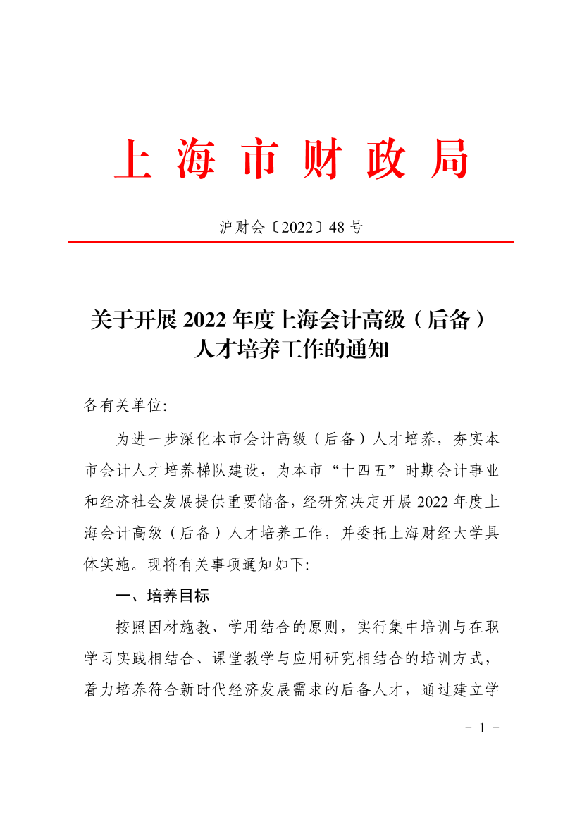 为进一步深化本市会计高级(后备)人才培养,夯实本市会计人才培养梯队建设,为本市“十四五”时期会计事业和经济社会发展提供重要储备,经研究决定开展2022年度上海会计高级(后备)人才培养工作,并委托上海财经大学具体实施。现将有关事项通知如下: