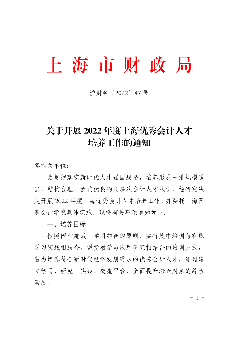 为贯彻落实新时代人才强国战略,培养形成一批规模适当、结构合理、素质优良的高层次会计人才队伍,经研究决定开展2022年度上海优秀会计人才培养工作,并委托上海国家会计学院具体实施。现将有关事项通知如下: