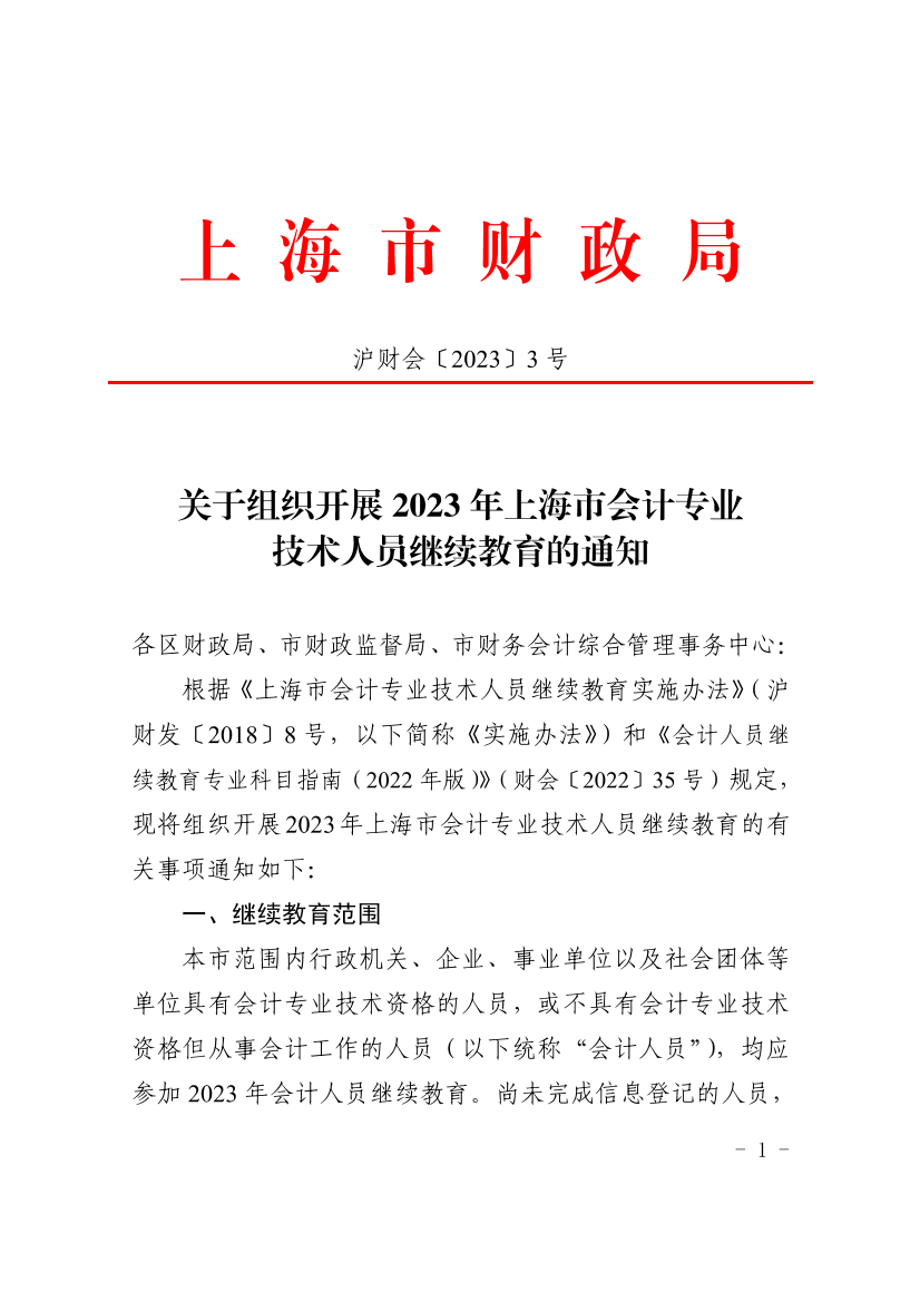 根据《上海市会计专业技术人员继续教育实施办法》(沪财发〔2018〕8号,以下简称《实施办法》)和《会计人员继续教育专业科目指南(2022年版)》(财会〔2022〕35号)规定,现将组织开展2023年上海市会计专业技术人员继续教育的有关事项通知如下: