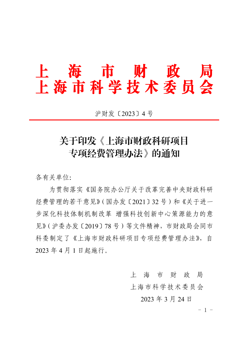 为贯彻落实《国务院办公厅关于改革完善中央财政科研经费管理的若干意见》(国办发〔2021〕32号)和《关于进一步深化科技体制机制改革 增强科技创新中心策源能力的意见》(沪委办发〔2019〕78号)等文件精神,市财政局会同市科委制定了《上海市财政科研项目专项经费管理办法》,自2023年4月1日起施行。