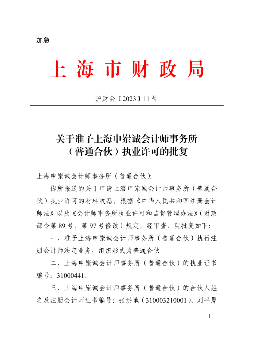 一、准予上海申岽诚会计师事务所(普通合伙)执行注册会计师法定业务,组织形式为普通合伙。