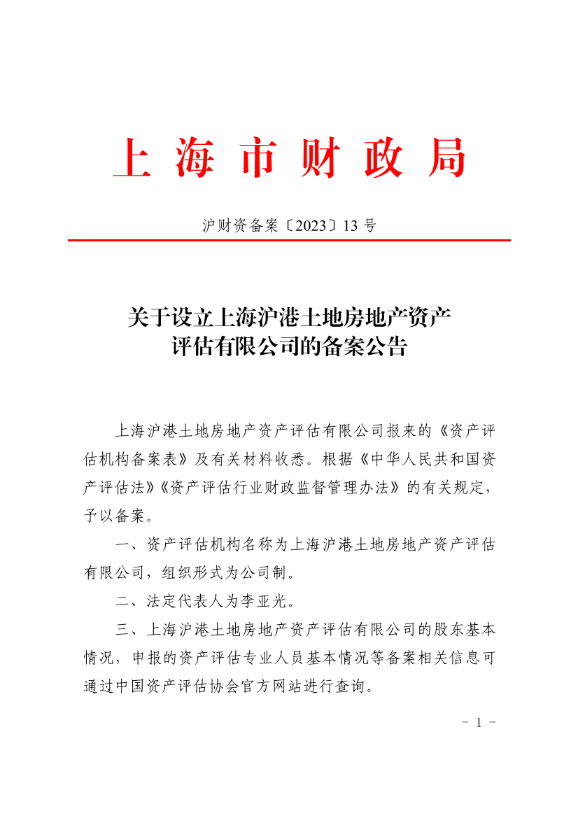 上海沪港土地房地产资产评估有限公司报来的《资产评估机构备案表》及有关材料收悉。根据《中华人民共和国资产评估法》《资产评估行业财政监督管理办法》的有关规定,予以备案。