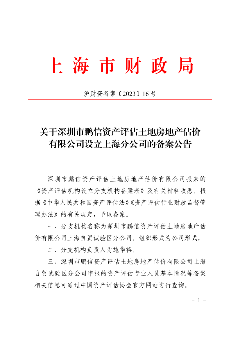 深圳市鹏信资产评估土地房地产估价有限公司报来的《资产评估机构设立分支机构备案表》及有关材料收悉。根据《中华人民共和国资产评估法》《资产评估行业财政监督管理办法》的有关规定,予以备案。
