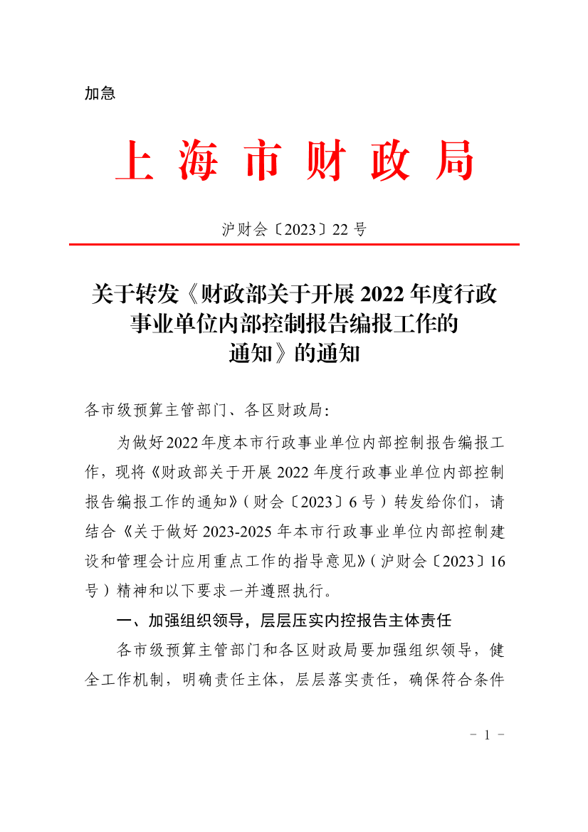 为做好2022年度本市行政事业单位内部控制报告编报工作,现将《财政部关于开展2022年度行政事业单位内部控制报告编报工作的通知》(财会〔2023〕6号)转发给你们,请结合《关于做好2023-2025年本市行政事业单位内部控制建设和管理会计应用重点工作的指导意见》(沪财会〔2023〕16号)精神和以下要求一并遵照执行。