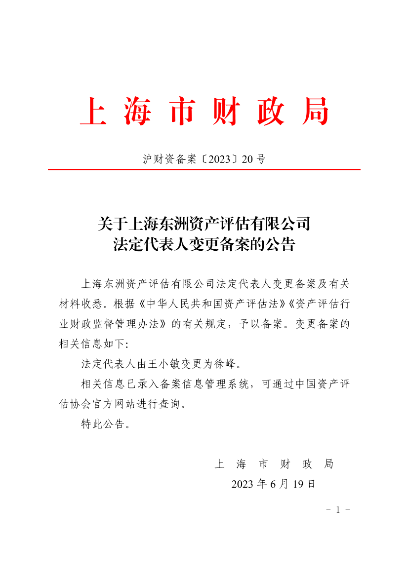 上海东洲资产评估有限公司法定代表人变更备案及有关材料收悉。根据《中华人民共和国资产评估法》《资产评估行业财政监督管理办法》的有关规定,予以备案。变更备案的相关信息如下: