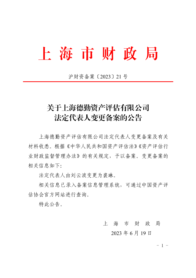 上海德勤资产评估有限公司法定代表人变更备案及有关材料收悉。根据《中华人民共和国资产评估法》《资产评估行业财政监督管理办法》的有关规定,予以备案。变更备案的相关信息如下: