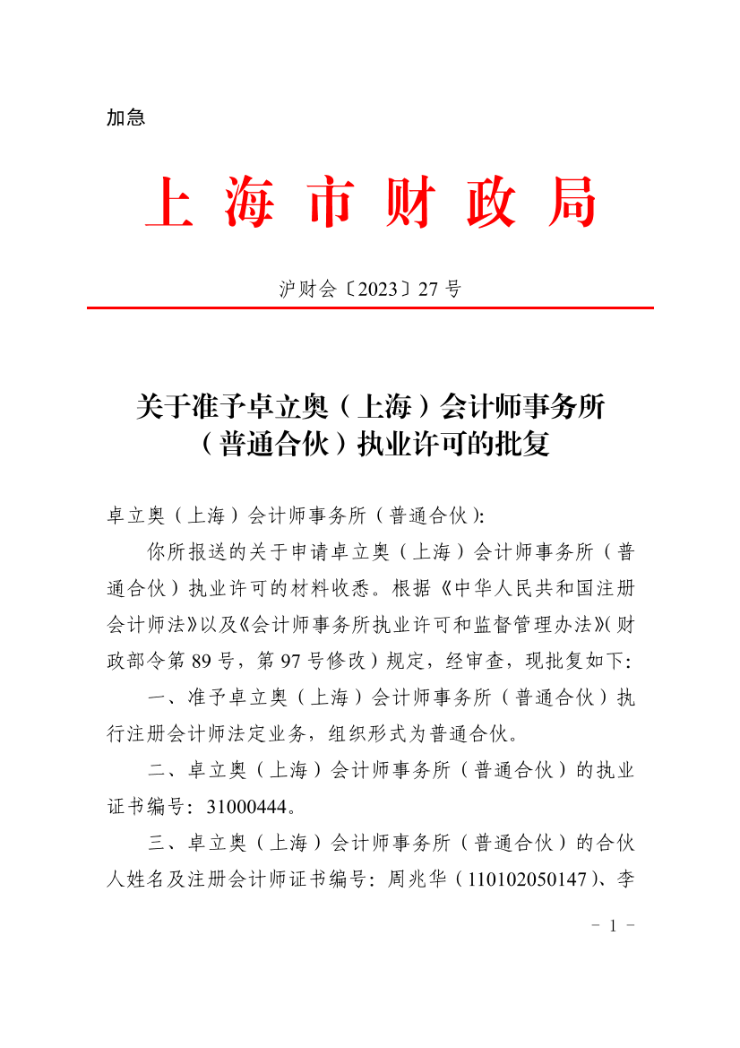 一、准予卓立奥(上海)会计师事务所(普通合伙)执行注册会计师法定业务,组织形式为普通合伙。