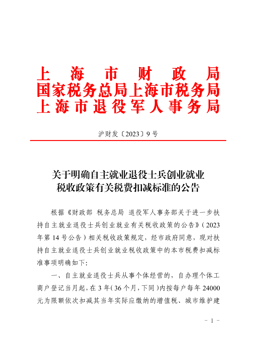 根据《财政部 税务总局 退役军人事务部关于进一步扶持自主就业退役士兵创业就业有关税收政策的公告》(2023年第14号公告)相关税收政策规定,经市政府同意,现对扶持自主就业退役士兵创业就业税收政策中的本市税费扣减标准事项明确如下: