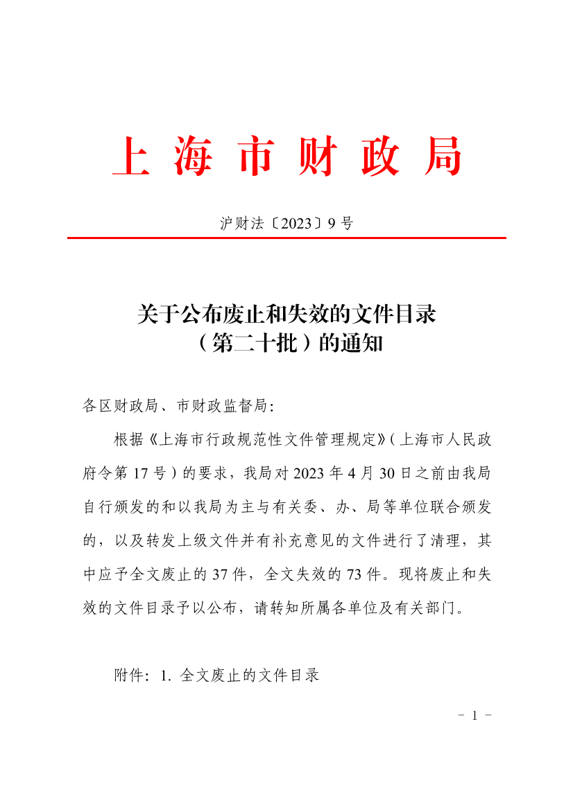 根据《上海市行政规范性文件管理规定》(上海市人民政府令第17号)的要求,我局对2023年4月30日之前由我局自行颁发的和以我局为主与有关委、办、局等单位联合颁发的,以及转发上级文件并有补充意见的文件进行了清理,其中应予全文废止的37件,全文失效的73件。现将废止和失效的文件目录予以公布,请转知所属各单位及有关部门。