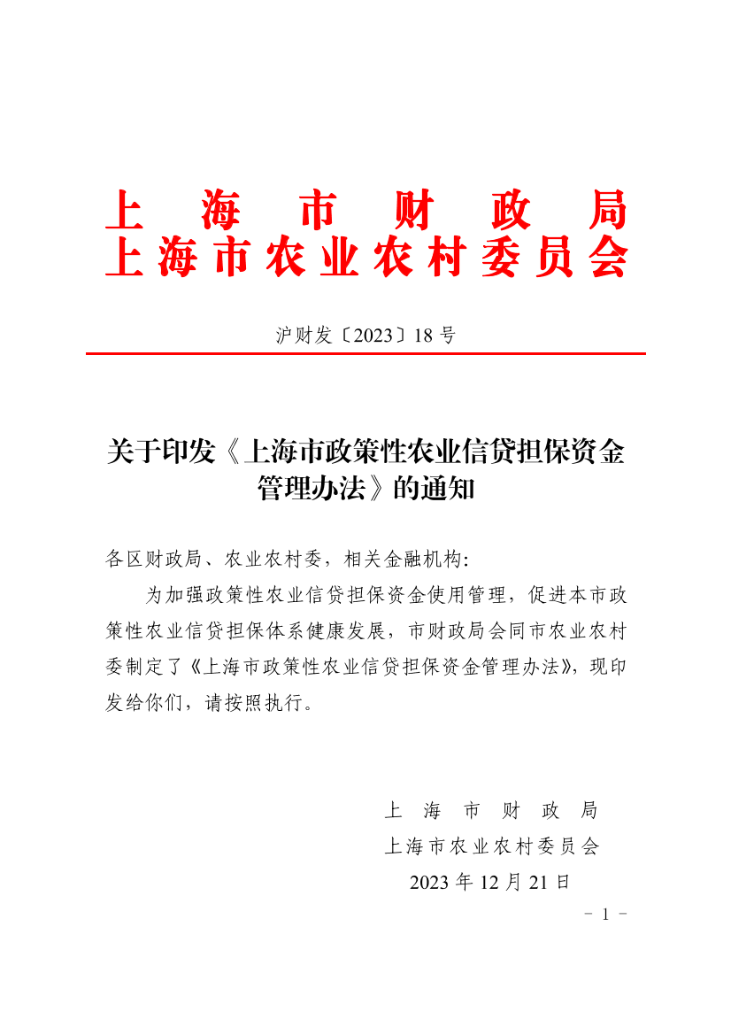 为加强政策性农业信贷担保资金使用管理,促进本市政策性农业信贷担保体系健康发展,市财政局会同市农业农村委制定了《上海市政策性农业信贷担保资金管理办法》,现印发给你们,请按照执行。