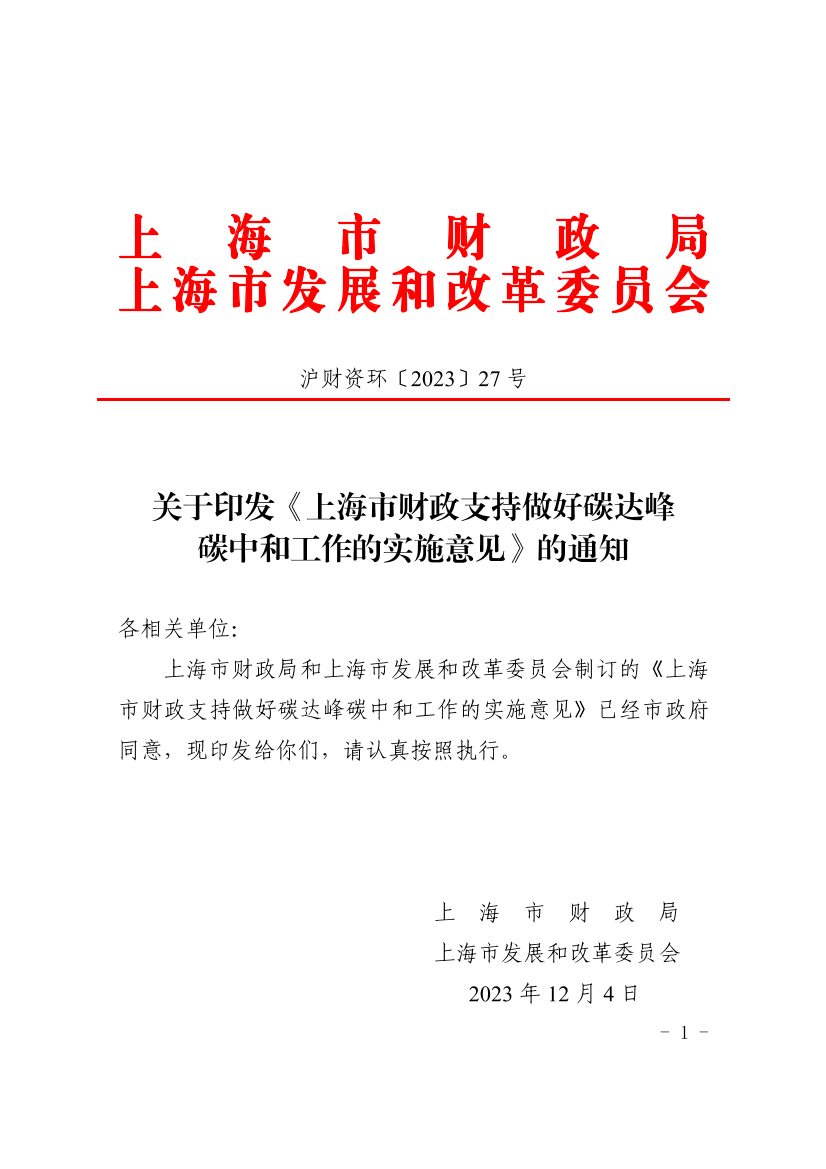 上海市财政支持做好碳达峰碳中和工作的实施意见